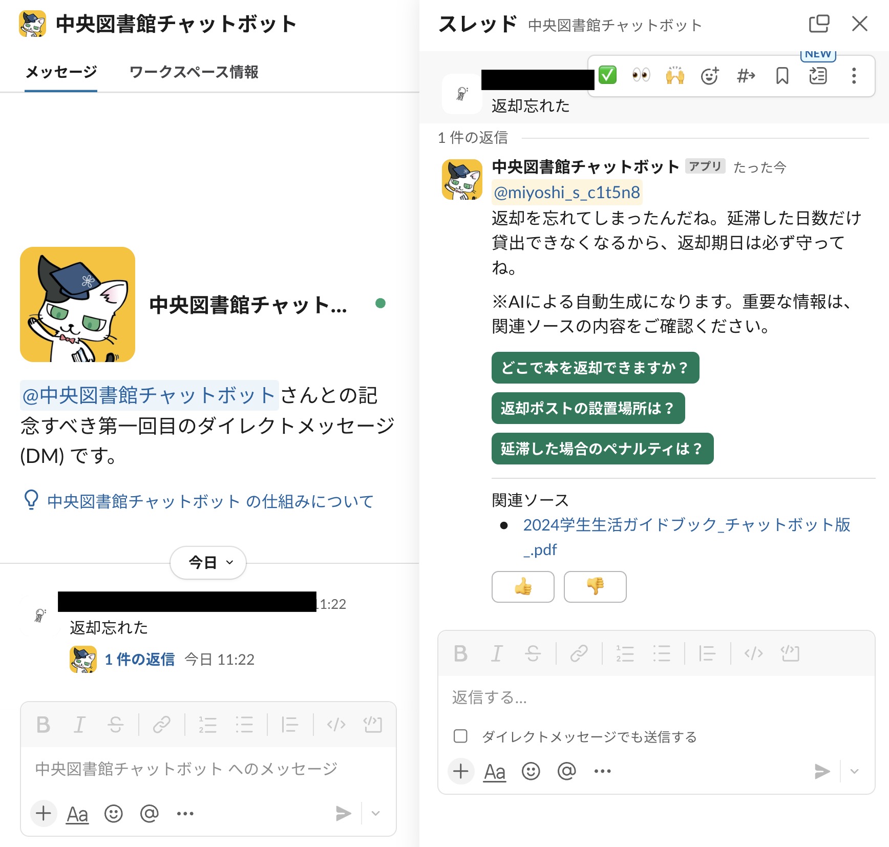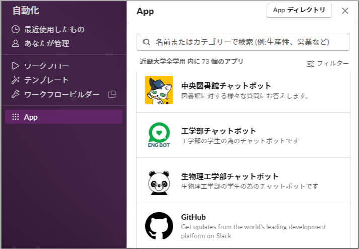 ×近畿大学では、「各学部の気軽なお問い合わせ窓口」としてチャットボットを設置しています。2024年11月に、Slackの各学部のチャットボットが全面リニューアルされました。ChatGPTを利用した生成AIを導入し、チャットボットに直接質問を投げると以前よりもさらに高い精度で質問に回答してくれます。下の各学部のリンクからチャットボットのアプリに飛べるので、履修登録や時間割などわからないことがあれば気軽に質問を投げてみてください。