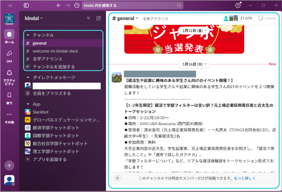 パブリックチャンネルは大学内の全学生や教職員が参加できる場所です。大学全体に関連するトピックやイベント、クラブ活動などを共有するのに適しています。 例えば、大学で行われるイベントなどの開催情報が共有され、学生同士で予定を調整したり、参加を呼びかけたりすることができます。