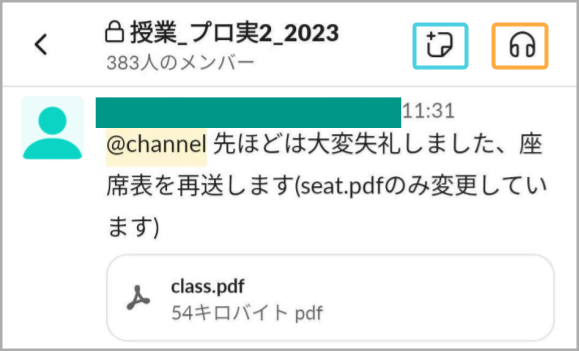 チャンネルではメッセージ、ファイルの共有、キャンバス(水色枠)、音声通話/ハドルミーティング(ビデオ通話、オレンジ枠)/画面共有が可能です。