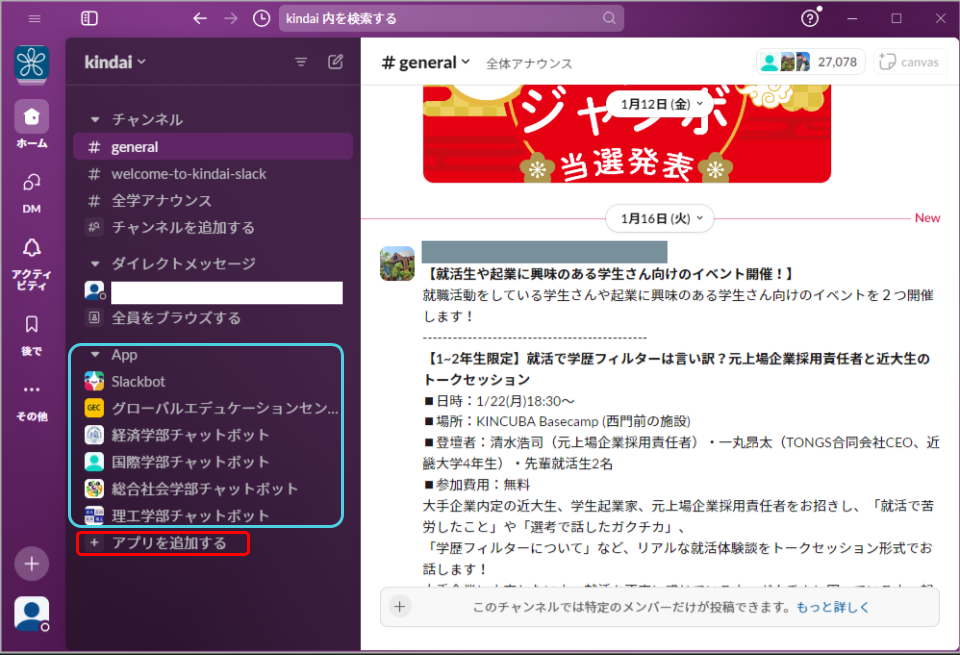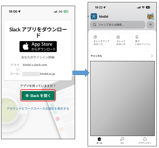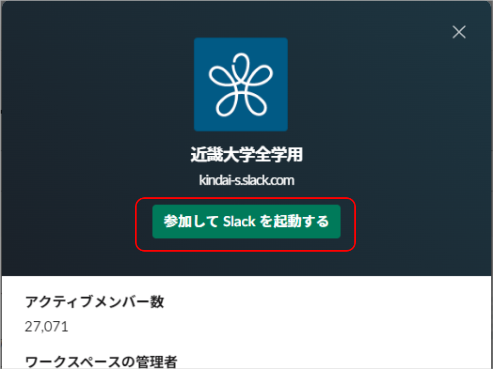 Slackアプリに切り替わり、少し待つと「近畿大学全学用ワークスペース」が表示されます。これでSlackを使う準備が整いました。