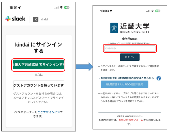 「近畿大学共通認証でサインインする」をタップしたあと、KINDAI IDを入力して「ログイン」をタップします。