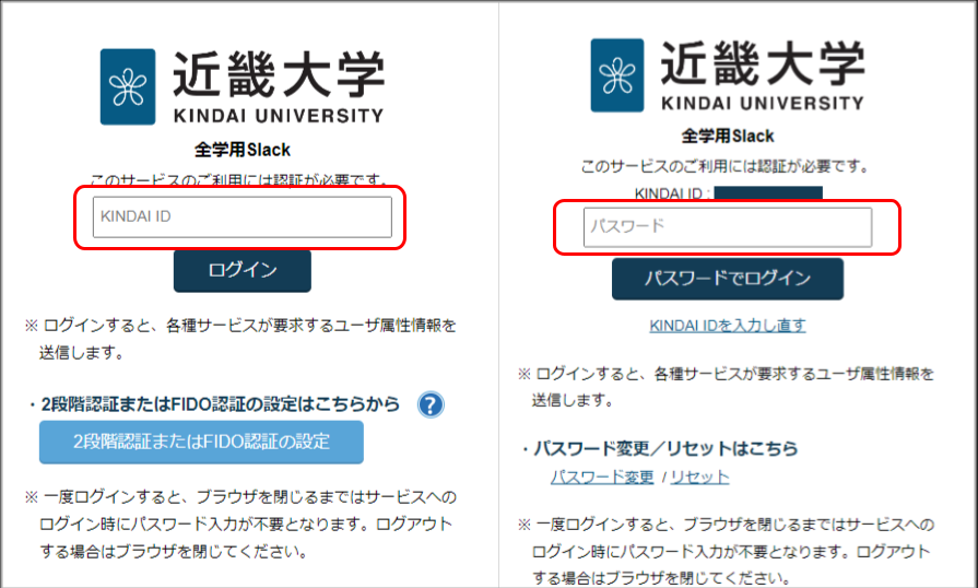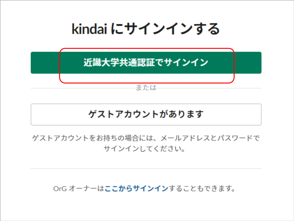 ダウンロードが終わったらhttps://kindai-s.slack.com/にアクセスして、 「近畿大学共通認証でサインイン」を押してください。