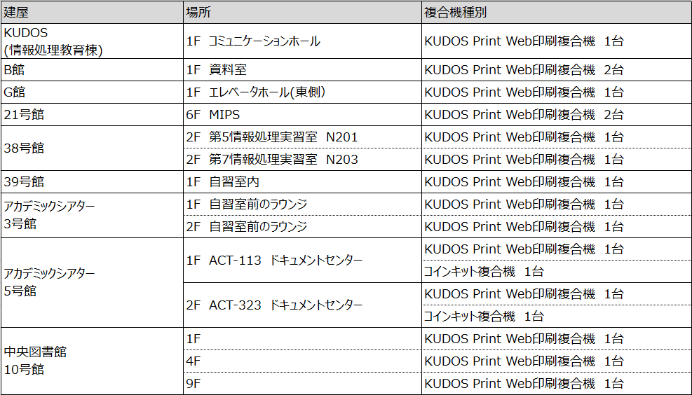 Web印刷複合機は、KUDOS、B館、G館、21号館、38号館、39号館、3号館、5号館、10号館に設置されています。
